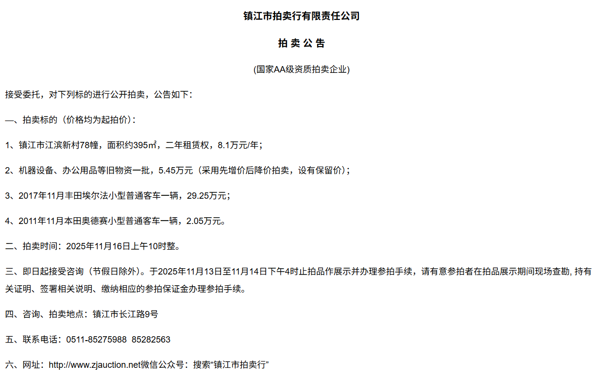 鎮江市拍賣行有限責任公司拍 租 公 吿(國家AA級資質拍賣企業)接受委托,對下列標的進行公開拍租(三拍),公告如下:—、拍租標的(以下價格均為半年至3年租賃權起拍價):1.  建行揚中豐裕支行營業網點二、三、四層經營用房(揚中市三茅鎮三豐南路5號),租賃面積約1080㎡,每層面積約360㎡,三拍底價11.98萬/年(0.3元/平方米/天)。2.  建行揚中油坊支行營業網點三、四層經營用房(揚中市油坊鎮太陽路129號),租賃面積約590㎡,每層面積約295㎡,三拍底價5.34萬/年(0.25元/平方米/天)。3. 建行揚中八橋支行營業網點三、四層經營用房(揚中市八橋鎮太平北路29號),租賃  面積約400㎡,三層約185㎡,四層約215㎡,三拍底價4.43萬/年(0.25元/平方米/天)。以上3套房產均可分層部分出租,拍租價=拍租面積*每平方米每天的租賃單價4. 建行鎮江團山路支行營業網點一層經營用房(鎮江市檀山路8號60幢102、103室),租賃面積約597.09㎡,三拍底價34.52萬/年。5. 建行丹陽原賢橋分理處營業用房(丹陽市城河路15-21號),租賃面積約93.88㎡,二拍底價7.16萬/年。二、拍租時間:2025年11月23日上午10時整。三、即日起接受咨詢(節假日除外)。于11月17日至11月21日下午4時止拍品作展示并辦理參拍手續,請有意參拍者在拍品展示期間現場查勘,持有關證明、簽署相關說明、繳納相應的參拍保證金辦理參拍手續。四、咨詢、拍租地點:鎮江市長江路9號五、聯系方式:0511-85275988   13655299933楊先生六、網址:http://www_zjauction_net.unchained-guide.com;微信公眾號:搜索“鎮江市拍賣行” 拍品清單2025.11.23序號名稱起拍價(元)標的說明1建行揚中豐裕支行營業網點二、三、四層經營用房(揚中市三茅鎮三豐南路5號),租賃面積約1080㎡,每層面積約360㎡三拍底價11.98萬/年(0.3元/平方米/天)1、1-3號房產均可分層部分出租,拍租價=拍租面積*每平方米每天的租賃單價;2、意向競拍人在拍賣前需持營業執照或身份證與委托方說明租賃房產經營業態,確定意向后出具房產承租用途承諾書,經委托方審核后,方可交納保證金參加競拍;3、租賃期限為半年至3年(承租方與出租方協商而定),承租方每半年或一年結付租金,租賃期間的水、電費用及其它相關費用均由承租方承擔;4、承租方不得用于經營和保管危險物品,不得用于開設餐飲、娛樂等可能嚴重影響消防安全、運營安全的經營業態,不得用于經營委托貸款、小額貸款等可能冒用委托方名義,帶來聲譽風險的經營業態。租賃期內,承租方不得破壞墻體結構,自行成就消防、安全等使用條件,不得擅自將租賃房屋轉租、轉讓給他人使用,否則委托方有權收回房屋;5、拍租成交后,承租方將租金交至出租方指定賬戶,傭金交至拍賣方賬戶(拍租傭金為該房屋一個月租金)。承租方憑租賃合同無息退還保證金。2建行揚中油坊支行營業網點三、四層經營用房(揚中市油坊鎮太陽路129號),租賃面積約590㎡,每層面積約295㎡三拍底價5.34萬/年(0.25元/平方米/天)3建行揚中八橋支行營業網點三、四層經營用房(揚中市八橋鎮太平北路29號),租賃面積約490㎡,每層面積約245㎡三拍底價4.43萬/年(0.25元/平方米/天)4建行鎮江團山路支行營業網點一層經營用房(鎮江市檀山路8號60幢102、103室),建筑面積約597.09㎡三拍底價34.52萬/年5建行丹陽原賢橋分理處營業用房(丹陽市城河路15-21號),建筑面積約93.88㎡二拍底價7.16萬/年
